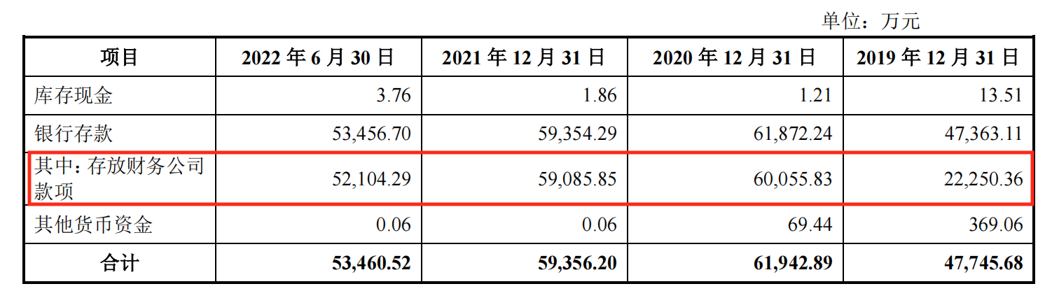 从账面资金来看,2020年公司完成业务重组并收到增资款,使货币资金余额迅速增长。2019年至2022上半年,公司模拟合并后货币资金分别为 4.77亿元、6.19亿元、5.94亿元、5.35亿元,占流动资产比例分别为 39.62%、48.79%、45.72%、35.35%。不过值得注意的是,公司几乎全部存款都放在财务公司中,存在资金占用风险,这或许是公司需要补流的原因之一。