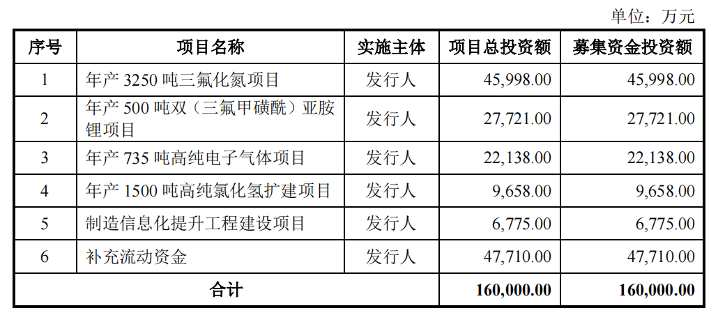 电子特种气体是集成电路、显示面板等行业必需的原材料,而处于行业领先地位的派瑞特气今日终于迎来科创板上会。本次IPO公司拟募资16亿元用于年产3250吨三氟化氮项目、年产500吨双(三氟甲磺酰)亚胺锂项目、年产735吨高纯电子气体项目、年产1500吨高纯氯化氢扩建项目、制造信息化提升工程建设项目以及补充流动资金。