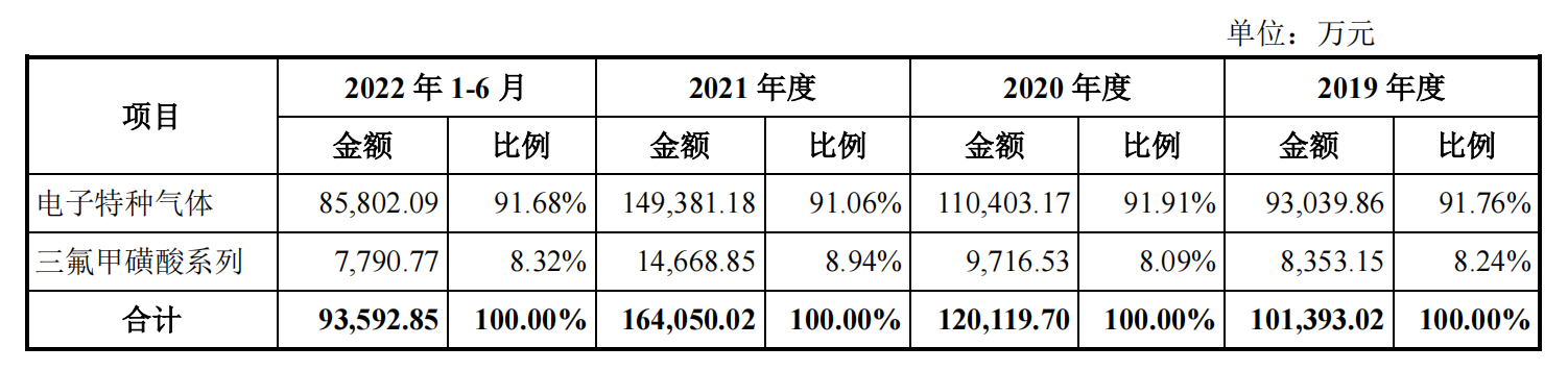 派瑞特气的主营业务收入以电子特种气体为主,占比超过90%,其中主要气体产品为三氟化氮、六氟化钨,二者收入合计占电子特种气体收入的 97.52%、96.92%、95.75%、92.50%,是其主要收入来源。此外公司还生产三氟甲磺酸系列产品,此业务收入呈逐年增长态势,但目前占比较小。