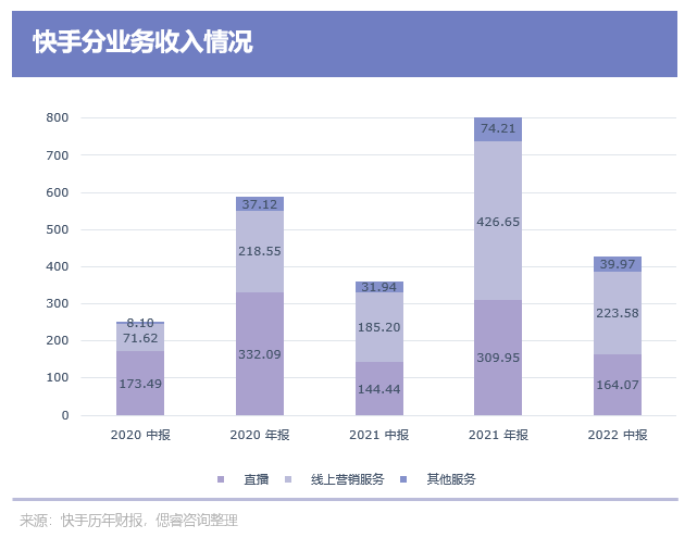 分业务来看,2022年上半年,快手直播打赏创收164.07亿元,占比38.37%;以广告费为主的线上营销,收入223.58亿元,占比52.28%;直播电商上半年收入9.35亿元。