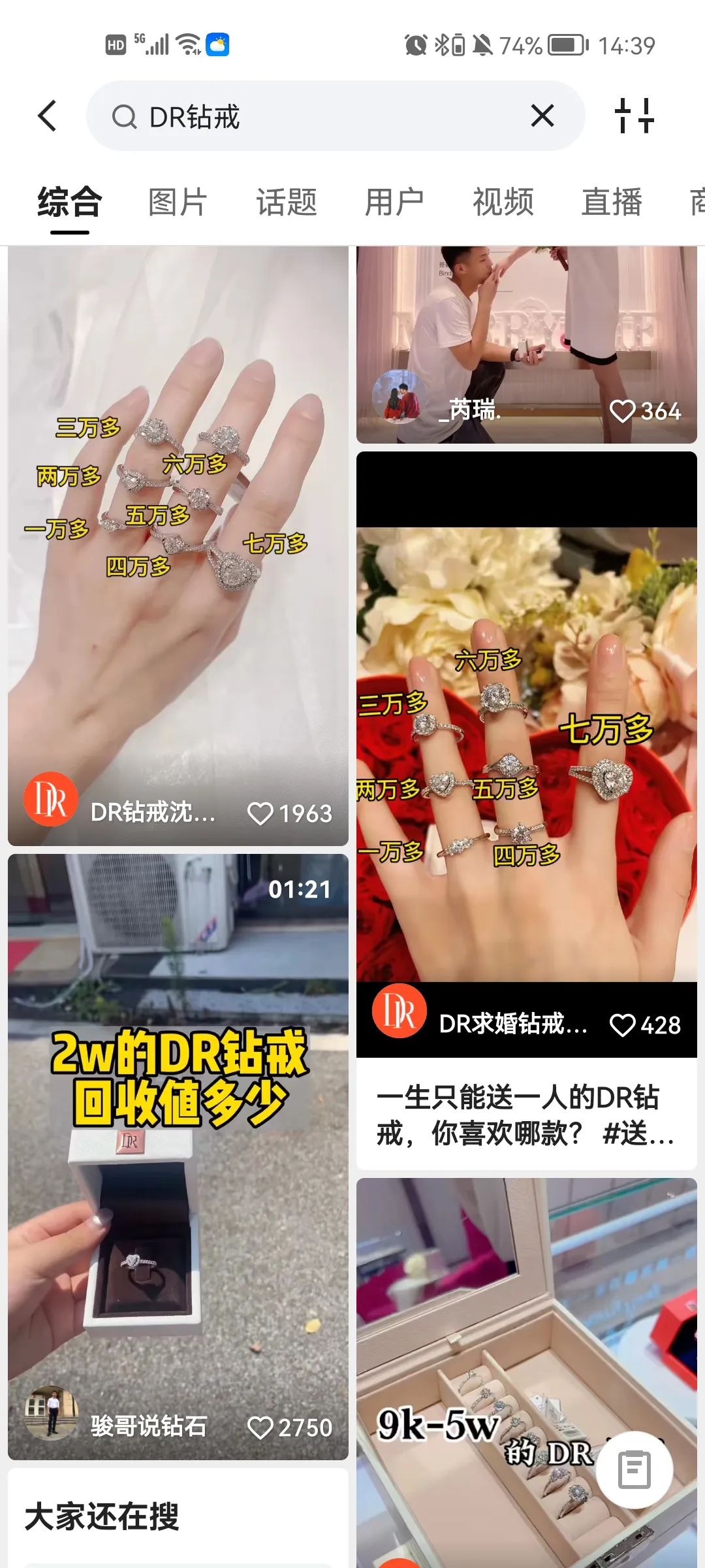 我们随手点开DR钻戒内容板块左上角第一个视频,全程是带一个钻戒,标一个价格,并没有解说,而排在最前面的50个视频,有20个视频是类似的播法。