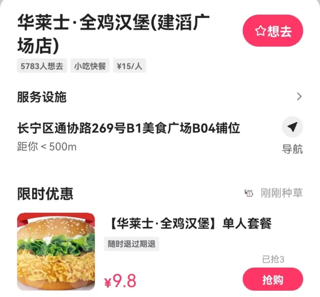 与此同时,记者仅仅是点进了快手的美团套餐看一看,快手就显示了工作人员“刚刚种草”,并且店铺名称下面的“5783人想去”却只有3个人去买,可以看出,**快手并没有帮助美团进行流量的精细转化,即流量并没有转化成订单。**