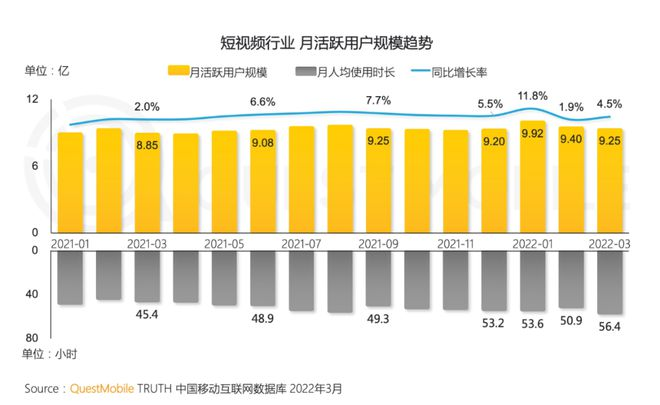 QuestMobile的数据显示,2021年初至2022年初,中国短视频行业行业的月活规模一直徘徊在9亿左右,并没有明显的增长,这表明短视频行业的用户已经触顶。