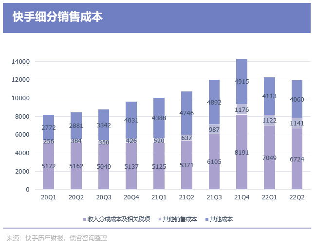 销售费用端,2022上半年销售费用87.62亿元,同比减少25.64%,快手表示是由于有效节制和控制用户获取与留存成本导致;