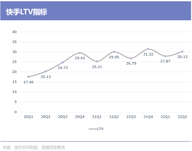 LTV=ARPU*1/流失率,用于衡量单个“老铁”给快手带来的经济贡献。我们用月均收入/MAU替代APRU,那么,从2020年至今,LTV总体呈现上升趋势,二季度达到历史高位;