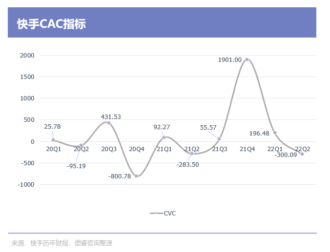 CAC=市场总花费/同时期新增用户数,用于衡量获客成本。分季度波动很大,综合上半年数据显示,快手用户获取成本在显著增大。