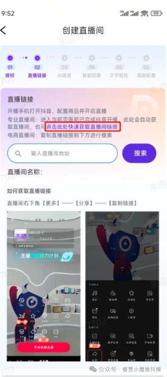 然后把直播间链接分享,粘贴在抖捧的APP中,选择关联话术、完成相关设置,就可以一键开播。