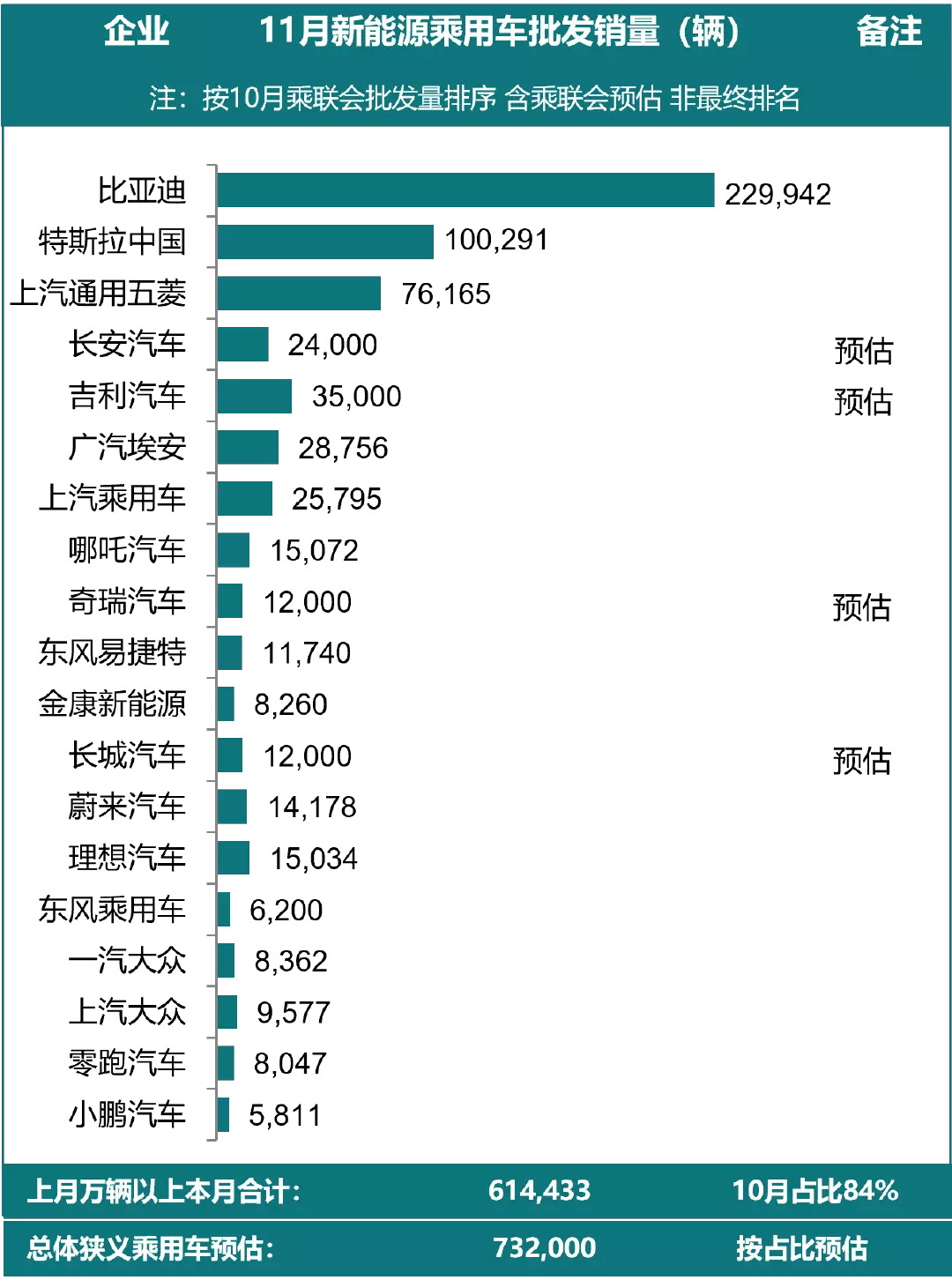 12 月 5 日,乘联会发布11月销量预估数据,赢家依旧是比亚迪和特斯拉。而3至7 名都是国内传统汽车企业,分别为上海通用五菱、长安汽车、吉利汽车,广汽埃安以及上汽乘用车。