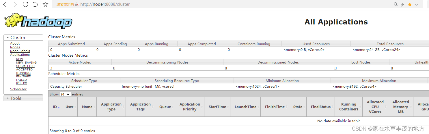 - YARN 集群地址:http://node1:8088/cluster