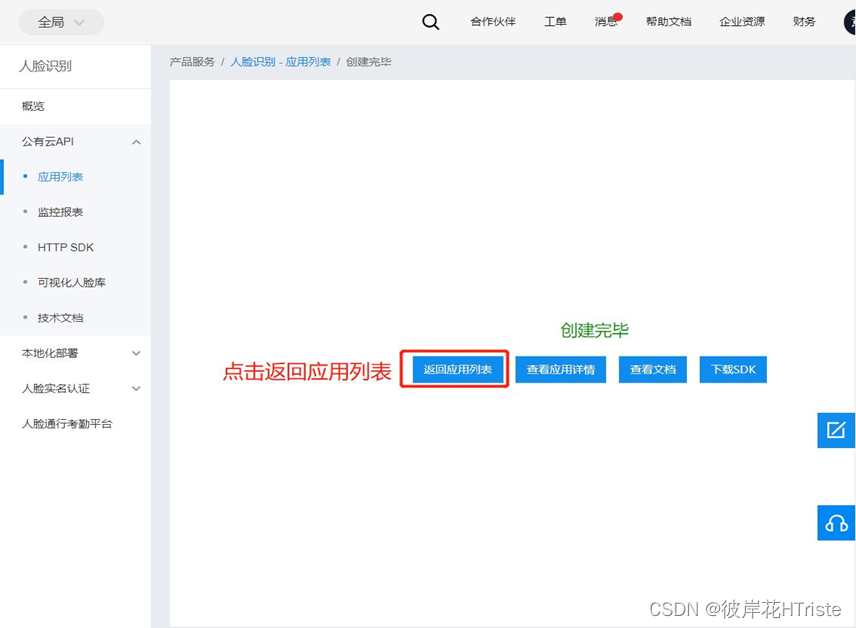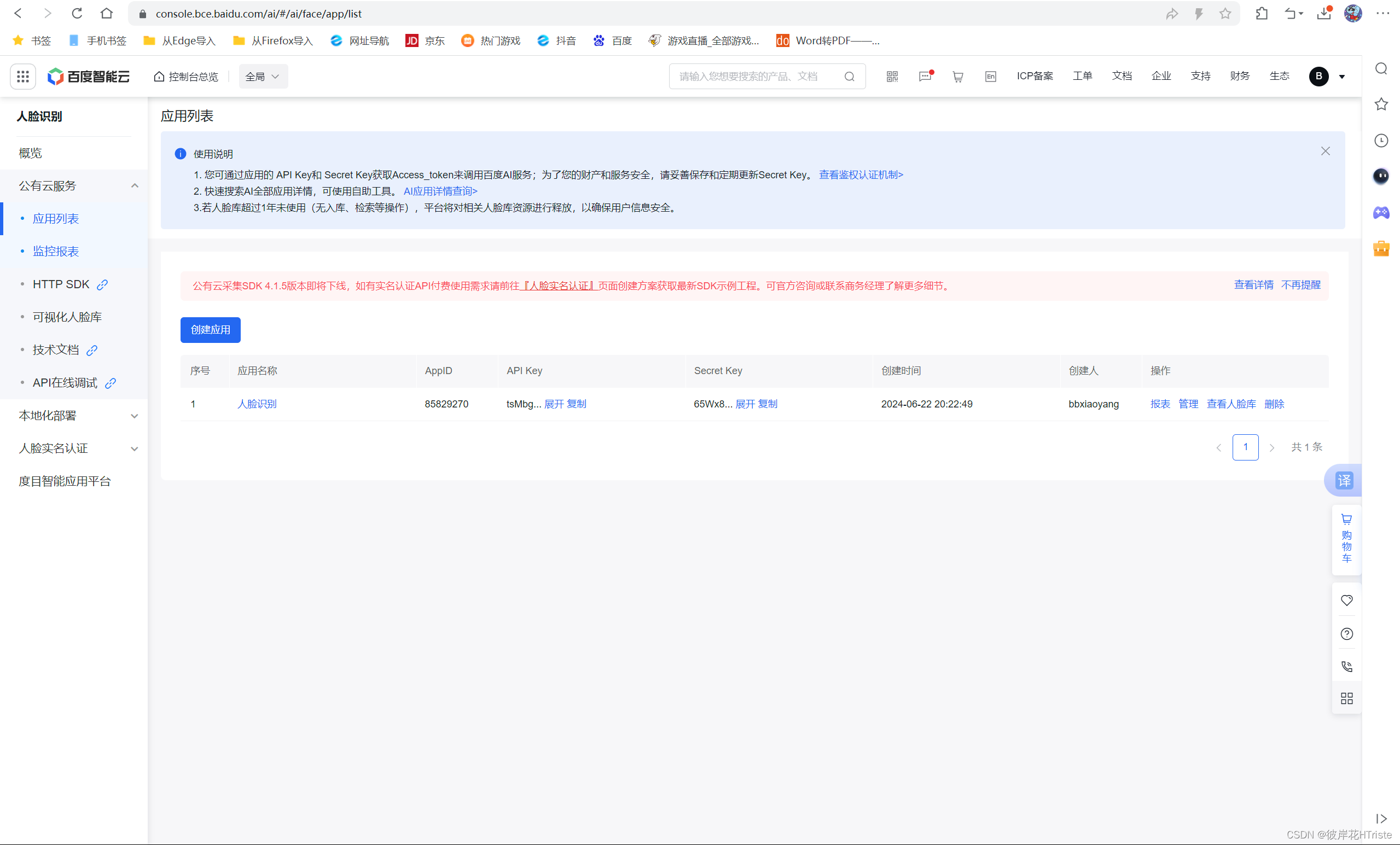 (5)点击返回应用列表即可看到刚才创建应用的详细信息,并且可以看到获取到的API key和Secret key。