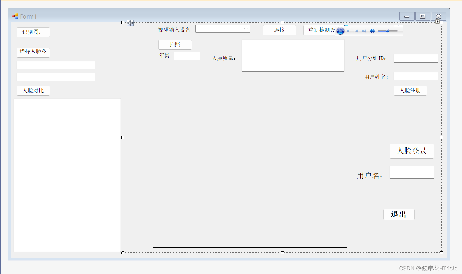 设置Windows Media Player控件的UI模式为“隐藏”。public Form1() { InitializeComponent(); axWindowsMediaPlayer1.uiMode = "Invisible"; client = new Face(API_KEY, SECRET_KEY); }