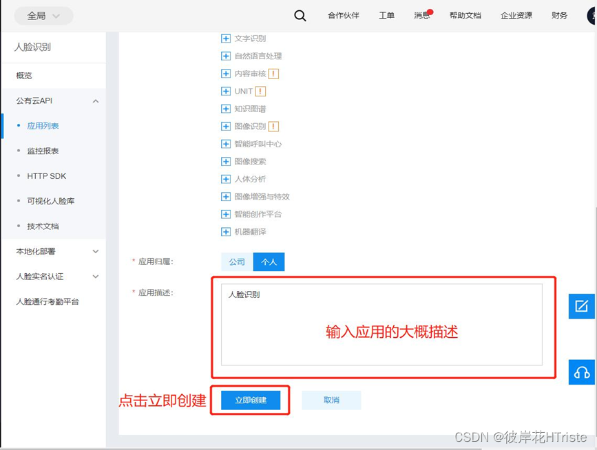 (4)在应用名称一栏输入所建应用的名称,在应用描述一栏输入对所创建应用的大概描述,然后点击立即创建。
