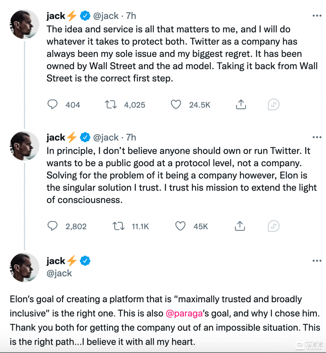 随后,推特创始人、前首席执行官 Jack Dorsey 也发布长文,就推特宣布与马斯克达成最终收购协议发表了看法,他表示,“马斯克将推特从华尔街收回,这是推特迈向正确方向的第一步。原则上,我认为推特不应该被任何人拥有或经营,推特应该成为协议级别的公共产品,而不是一家公司。然而,要解决这个问题,马斯克是我唯一信任的解决方案,马斯克将创建一个最大程度信任和广泛包容的平台,这个目标是对的,也是我选择他的原因。”
