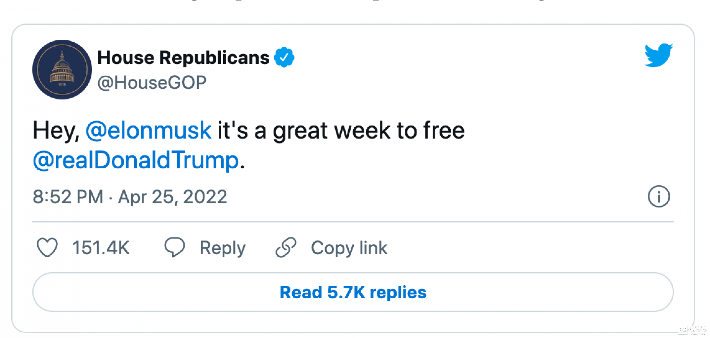 马斯克曾表示,自己是“言论自由的绝对主义者”,而“美国前总统被封 Twitter 账户”这件事,刚好是对这一理想的有力考验。2021 年 1 月,特朗普的推特账户在国会大厦骚乱后不久被永久封禁,因为该公司称,特朗普多次违反公司规定,并有“进一步煽动暴力”的风险。