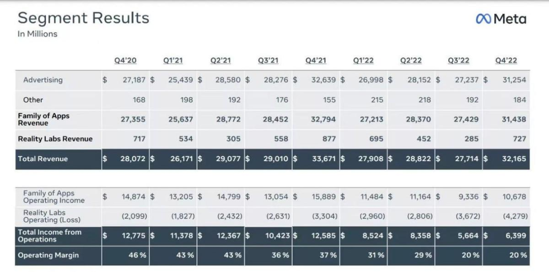 今年2月2日公布的2022年第四季度及全年财报显示,Meta第四季度总营收为321.65亿美元,超出了市场预期,但是较上年同期的336.71亿美元下降了4%,公司连续三个季度出现营收同比下滑。净利润为46.52亿美元,较2021年同期的102.85亿美元降低了55%。