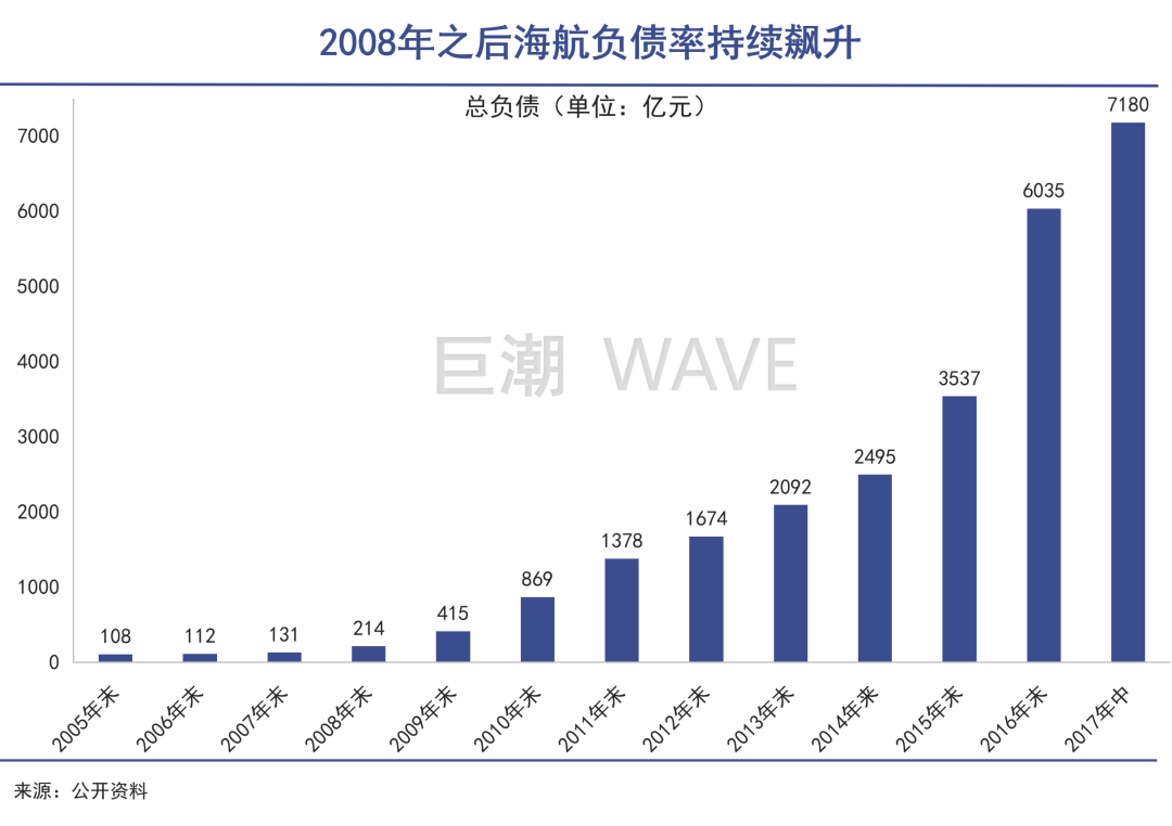 但硬币的另一面,大肆收购的同时,其负债也持续累积。2015年到2017年,海航集团新增有息负债3668亿元。2018年底,海航负债率达到70.55%,总负债规模为7500亿元。