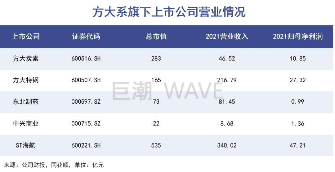 同时,“方大系”旗下的上市公司也更新为五家,分别是方大炭素、方大特钢、东北制药、中兴商业和ST海航。