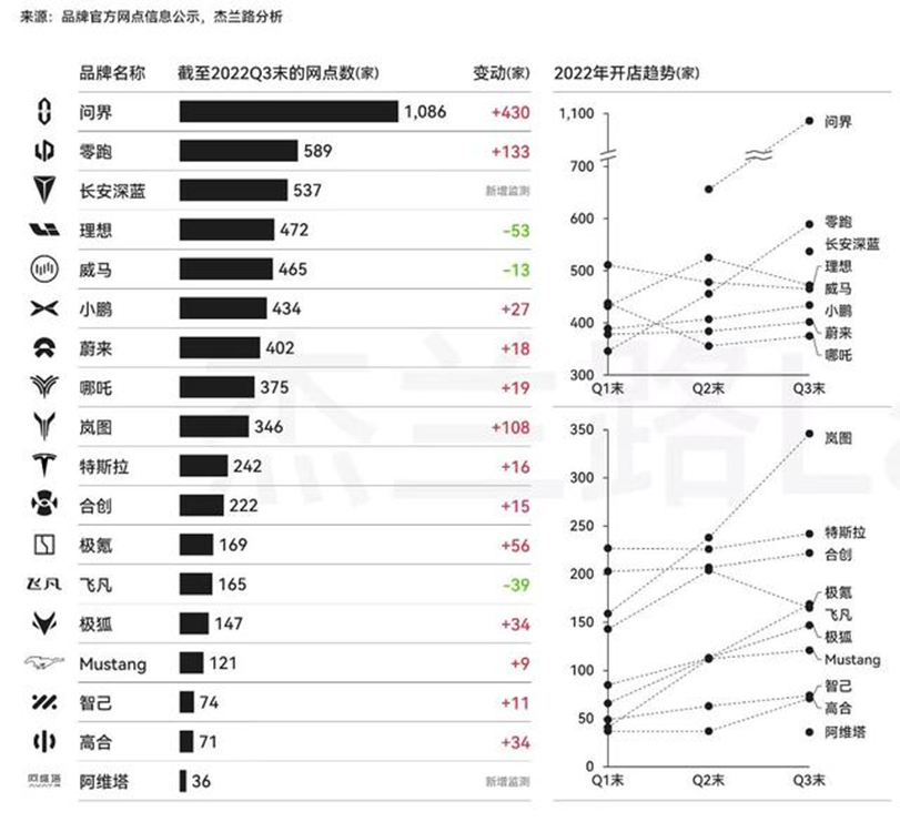 而更具震撼效应的是塞力斯与华为联合推出的问界汽车,截至2022年Q3,问界汽车的网点数量达到了1086家,大幅领先于第二名的零跑汽车;问界汽车新增网点数量达到了430家,与其他友商最多100余家的增量已经不是一个量级。