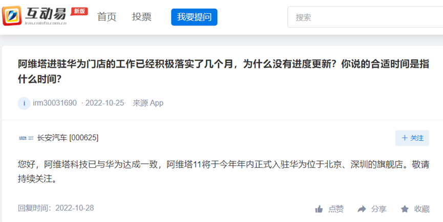 近日,按照阿维塔股东——长安汽车(000625.SZ)在深交所互动易平台上的回复所示,阿维塔已经与华为达成一致,旗下的首款车型阿维拉11将在今年12月正式入驻位于北京、深圳的华为线下门店。
