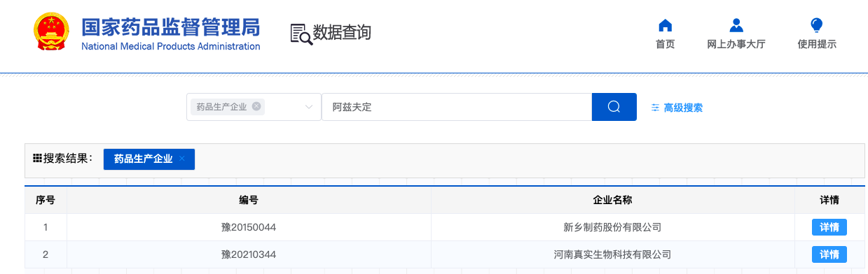 钛媒体App查询了国家药品监督管理局官网,在药品企业限定条件下,搜索“阿兹夫定”,相关企业仅真实生物、新乡制药,后者为拓新药业子公司。也就是说,截至目前,仅拓新药业在生产阿兹夫定原料药,其他药厂并没有阿兹夫定的生产许可。