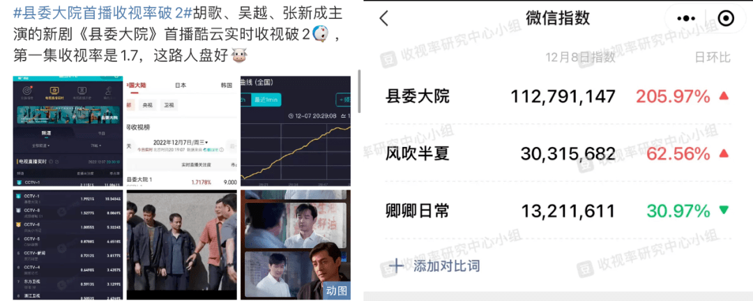 开播2小时,由胡歌、吴越、张新成等主演的《县委大院》首播酷云实时收视破2,“县委大院”关键词微信指数破亿、且搜索日环比涨了205.97%,这两组数据都打破了今年爆剧热度的天花板。