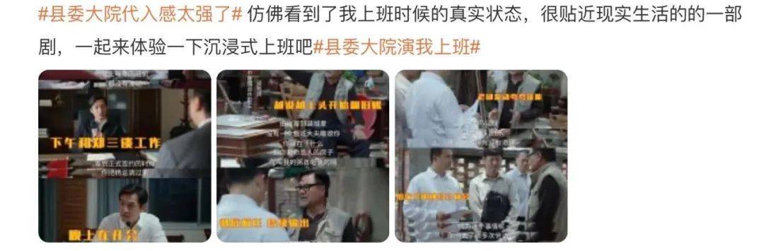这类话题能上热搜,说明了《县委大院》可主打的一个营销方向是“体制内职场指南”。就如之前“厅局风”作为一种新世代审美在短视频爆红一样,体制内职场的“领导学”有望成为《县委大院》出圈营销的一个爆点。