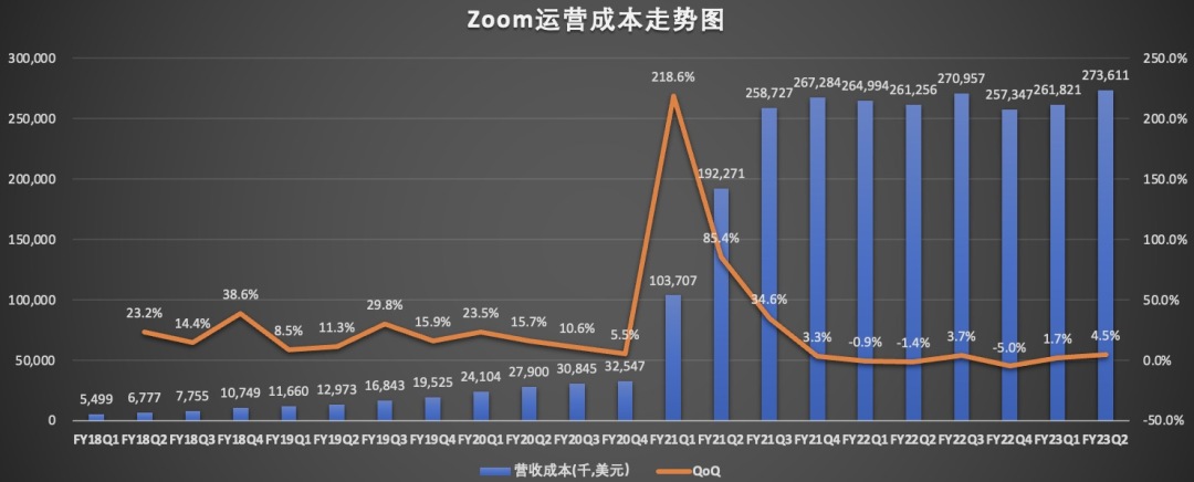 从2022财年伊始,Zoom就在有意识的控制运营成本。财报显示,2023财年第二季度Zoom的运营成本为2.74亿美元,同比增长4.7%。