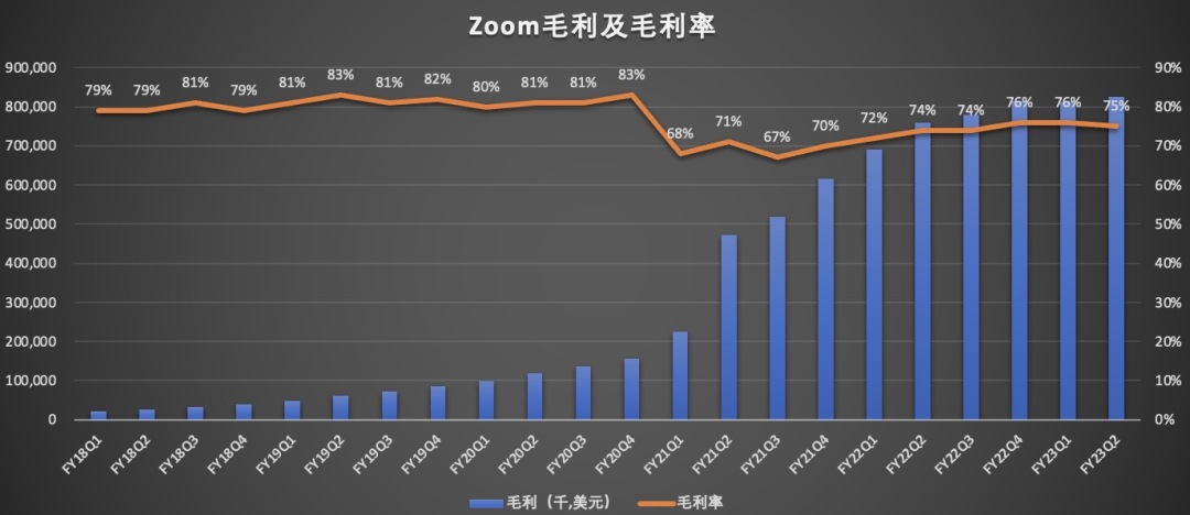 报告期内Zoom的毛利为8.26亿美元,同比增长8.6%,毛利率从上年同期的74%,小幅上涨至本季度的75%。