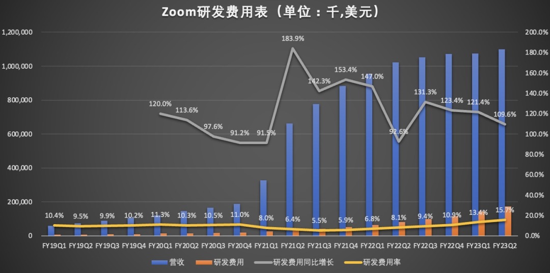 数据显示,报告期内,Zoom的研发费用为1.73亿美元,同比109.6%,研发费用率从上年同期的8.1%,上升至本季度的15.7%。