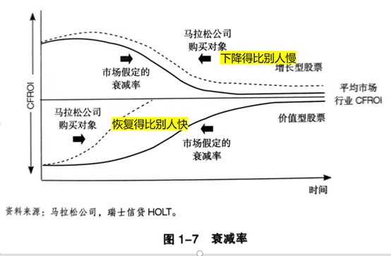 这个体系用**“衰减率”代表行业或公司从周期高点和低点分别向下和向上回归正常水平时的速率**。以平均回报为基准,成长与价值分列上下两部分,有不同的特征: