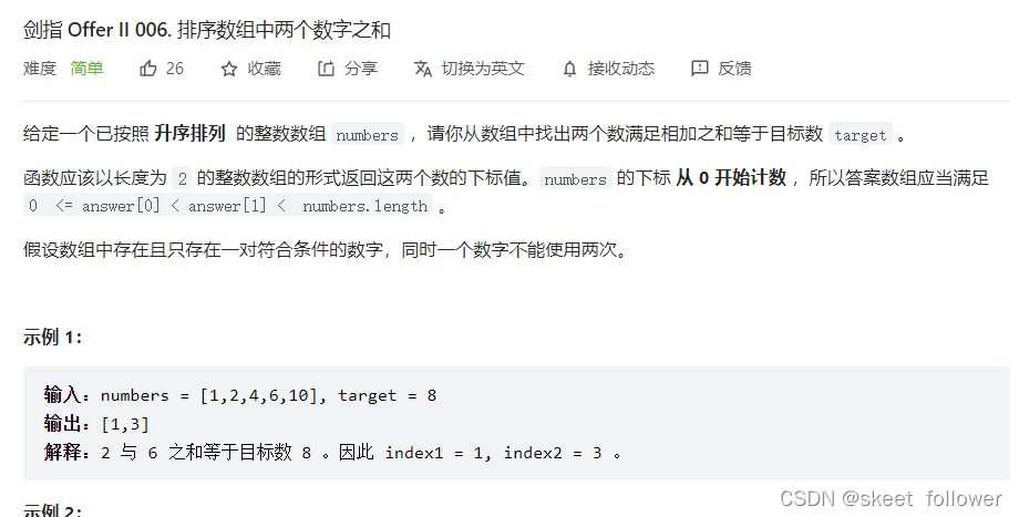 思路:一看这道题目就很容易想到循环暴力破解,时间复杂度为n²。这样肯定不太理想,所以得换解法,题目已经说了是已排序数组,那么就可以用二分查找,先给定首指针元素,然后再用K去减去首指针元素,再去二分查找剩下一个元素在不在数组。然后首指针右移,这样就能全部找出来了,这种解法的时间复杂度为NlgN。这道题还有另一种解法,我们可以设置左右指针同时扫描,扫描出两个数之和等于K,那么这两个数就是要找的那两个数。