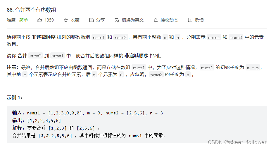 思路:可以将先将nums2数组放到nums1后面然后再用sort进行排序即可,这个方法我就不写了,我主要是帮助大家练习前面排序算法学到的思想来做这道题.也可以用快排里面的双指针方法来做这道题