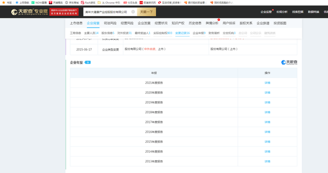 可对比偿债压力的增长,美年健康似乎还未能构建起长期稳定的盈利能力。据天眼查APP数据显示,公司2017年净利润为6.14亿,而到2019年则亏损8.66亿,2020年盈利润为5.54亿,到了2021年净利润却仅为0.64亿。至于刚刚发布的2022年半年度业绩预告更是显示,今年上半年,公司归属于上市公司股东的净利润为亏损6.3亿—6.8亿,较上年同期亏损有所增加。