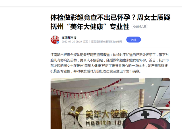 据江南都市报报道,在今年6月24日,抚州市东乡区的一位周女士来到抚州“美年大健康”体检。而在进行彩超检查时,周女士听到医生私下议论,说她可能有子宫肌瘤。于是,周女士便主动询问对方“有没有问题”,而对方则是让她去医院做进一步检查。