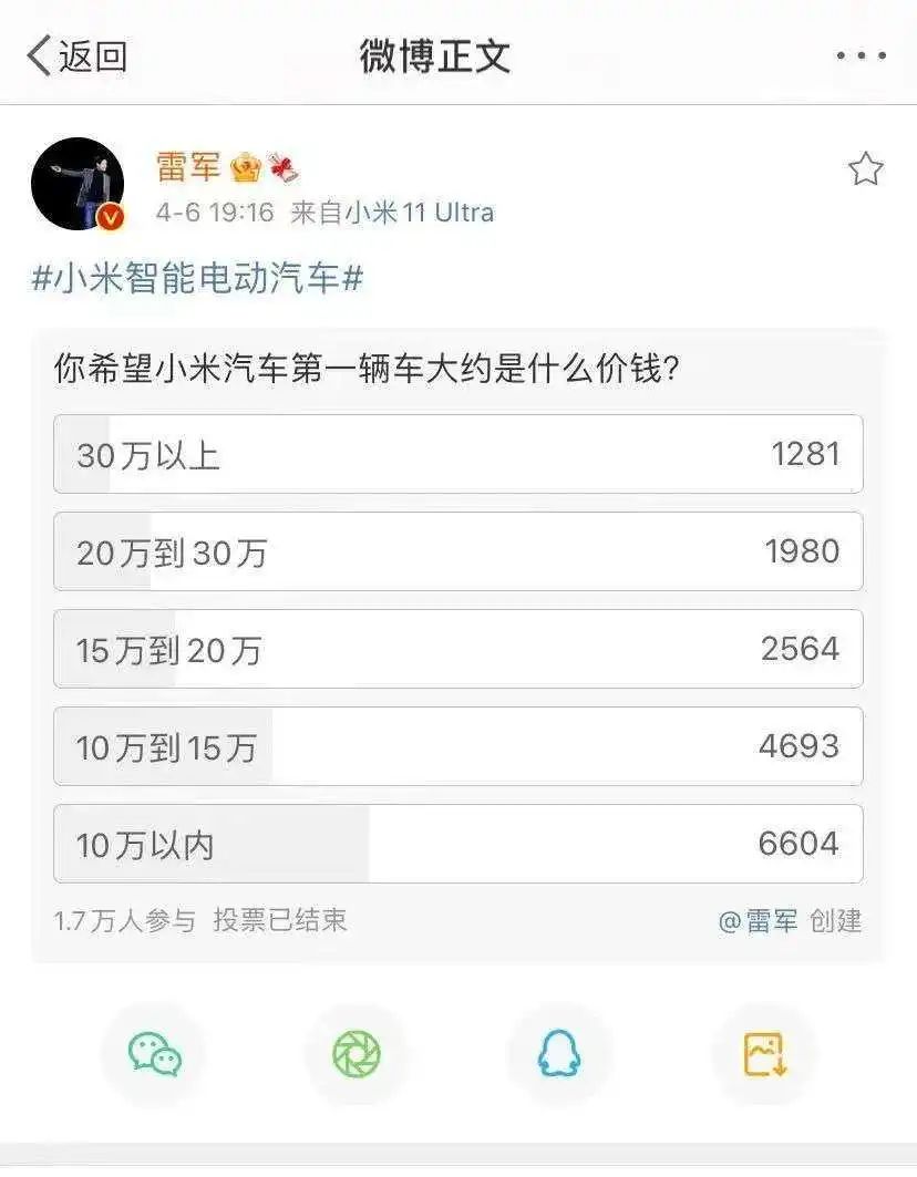 根据去年雷军在微博发起的小米汽车价格投票结果显示,在1.7万投票者中,有近7成人希望小米第一款车不超过15万元,这也符合之前小米售价走极致性价比的路线,会更受米粉群体青睐。而投票给30万元以上定价的人群,还没有占到参与投票总人数的1成。