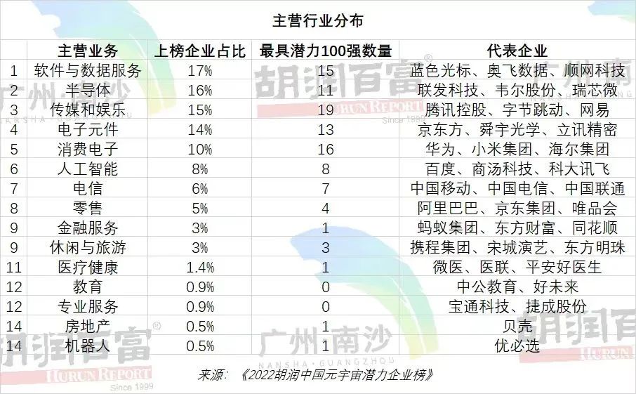 从这个榜单的上榜企业主营业务来看,元宇宙的五大领域(底层技术、生态应用、平台技术、终端产业、网络技术),都有相关的公司切入布局。