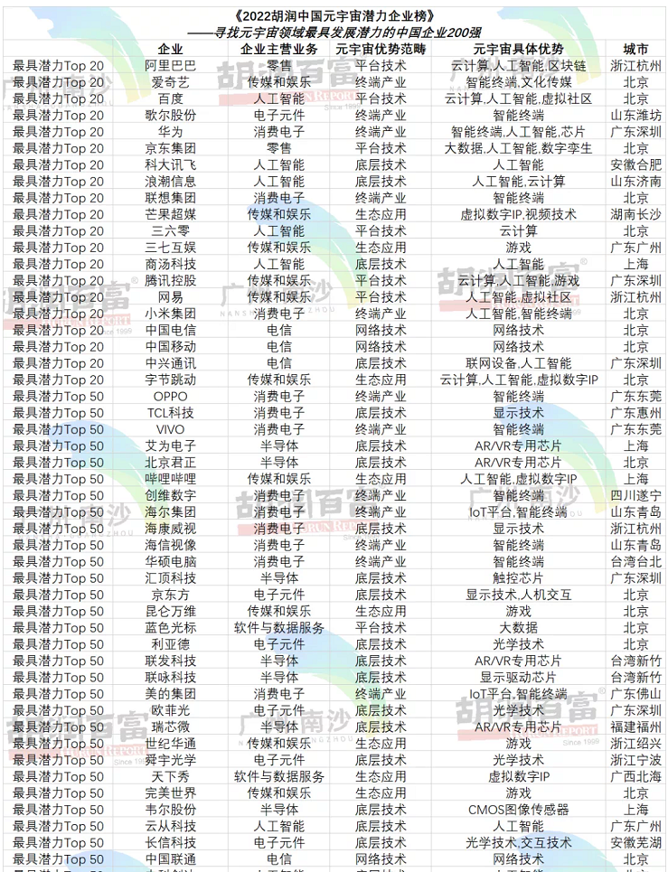 当前,胡润研究院发布《2022胡润中国元宇宙潜力企业榜》,列出了元宇宙领域最具发展潜力的中国企业200强。其中,上市公司占比90%。入围的200强企业中,芯片和数据服务公司超过70家,占榜单总数的三分之一。