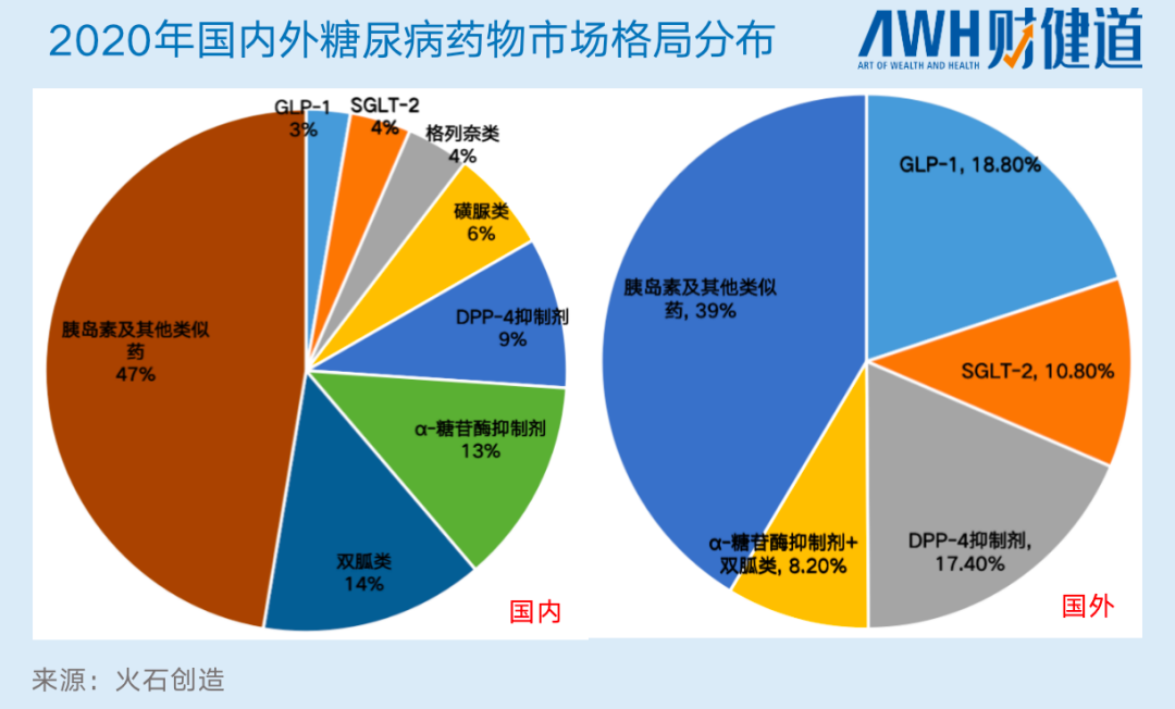 其中,GLP-1类药在中国降糖药市场占比极低,仅为1%左右,全球GLP-1类药占到降糖药物市场的12%。以2020在糖尿病治疗市场分布来看,国内,GLP-1(利拉鲁肽、司美格鲁肽等)仍处于萌芽阶段(占比2.6%),明显少于国外,但使用者近两年来逐渐增多。