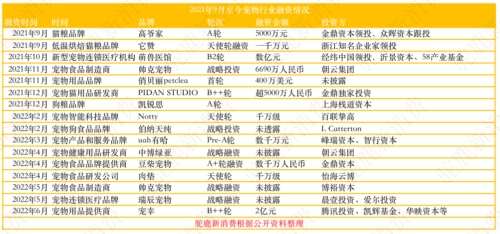 而从驼鹿新消费整理的融资数据来看,近半年宠物赛道的融资情况较稳定,放长到年份来看,近两年宠物经济赛道也非常受资本市场青睐。