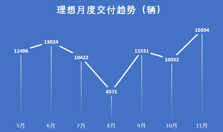 不过从后续的交付趋势来看,理想的交付虽然在8月份打骨折,但也很平稳的完成了新旧产品的切换,后续的三个月中逐渐回归高位,到11月,理想以15034辆的交付成绩打破自己的月度交付记录。