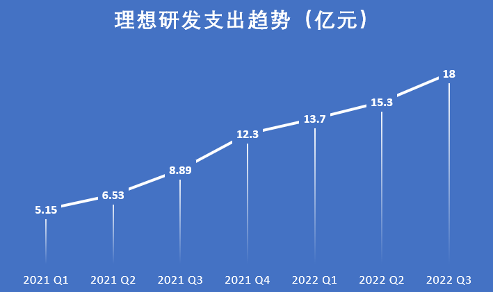 财报显示,理想的研发支出,在今年第一季度就超过了小鹏,到今年第三季度这个数据已经增长到18亿元,达到理想有史以来的最高点。