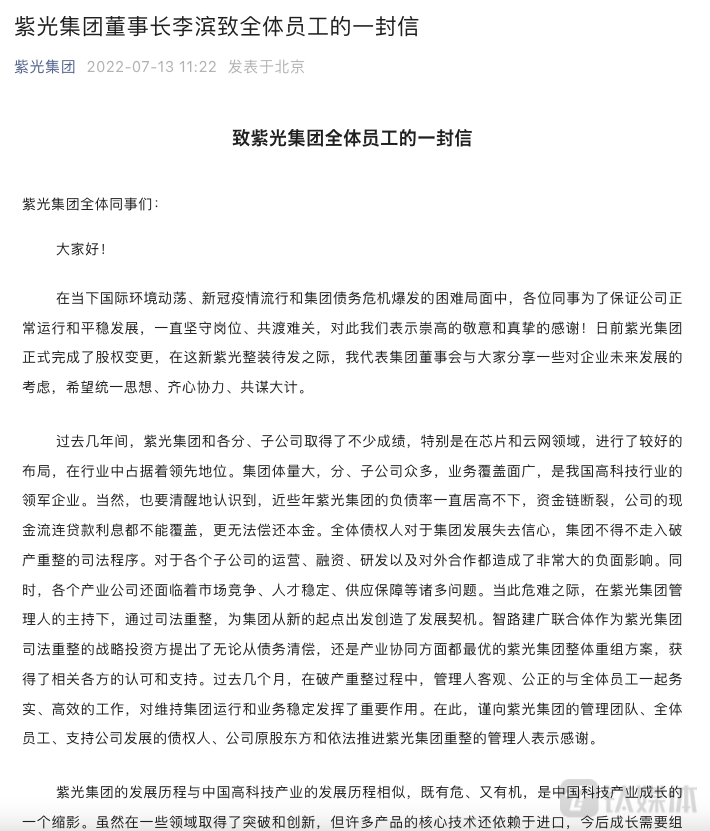 7月13日,据紫光集团公众号,李滨首次以紫光集团新任董事长身份发布“致全体员工的一封信”,第一次****公布了新管理层对集团未来发展的计划。