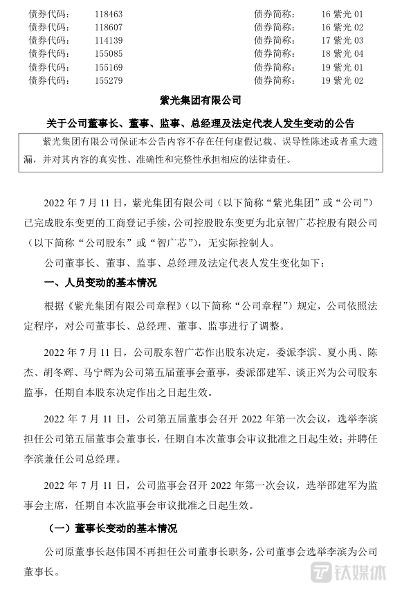 工商变更之后,智广芯迅速对紫光集团进行了人事任命,于7月11日由董事会选举李滨为董事长,接替赵伟国。