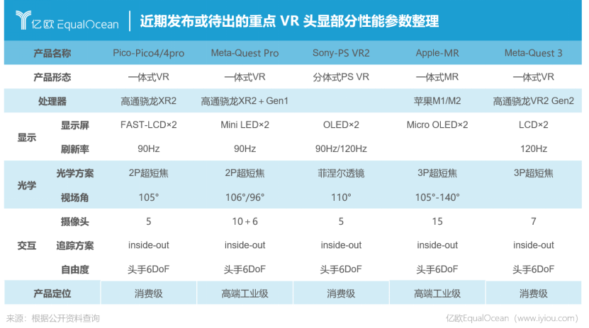 虽然技术突破面临困难,近一年发布的Meta Quest Pro、索尼 PSVR 2以及待出的苹果 MR 一体机均搭载眼动追踪功能,为眼动追踪的消费级落地揭开序幕。