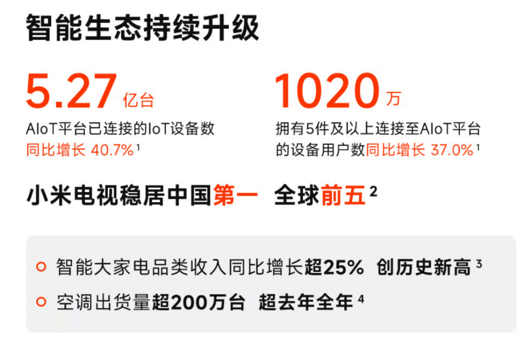 以小米为例,财报显示,截止2022年中,其AIoT平台已连接的IoT设备(不含手机、平板以及笔记本电脑)为5.27亿台,同比增长40.7%。拥有5件及以上连接至AIoT平台的设备((不含手机、平板以及笔记本电脑))用户数达1020万,同比增长37%。