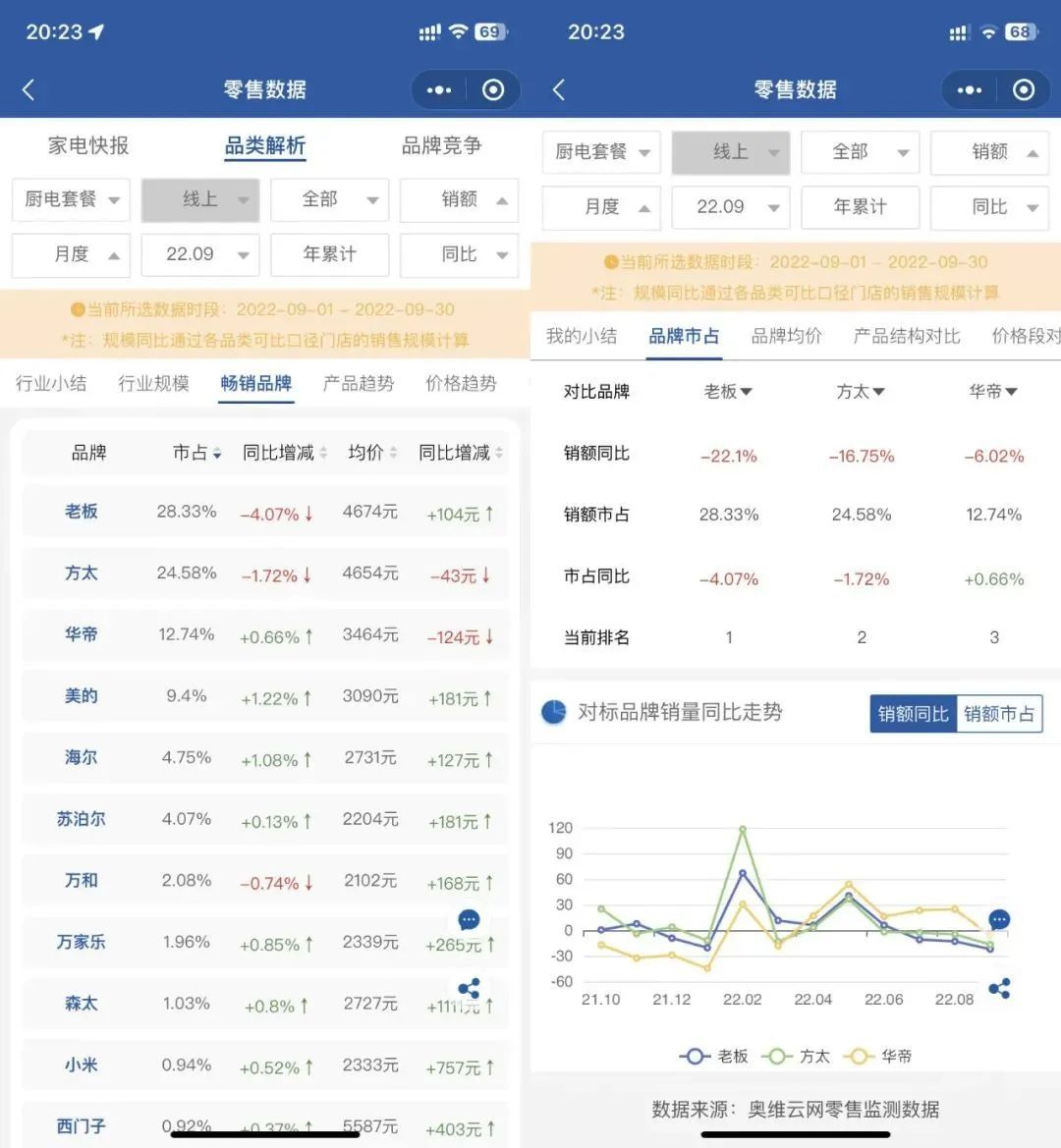 奥维云网数据显示,2022年9月线上渠道的厨电套餐市场,方太的销售额市占率为24.58%,虽然仍位列第二,但同比下滑1.72%。作为对比,美的、海尔、西门子等传统黑白电企业的销售额市占率却保持增长态势。