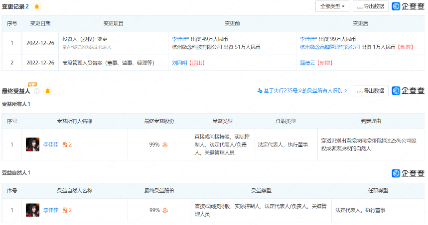 在公开达成和解的前一天,四川子柒文化传播有限公司的高级管理人员备案发生了变动,刘同明退出,蒲倩云新增,李佳佳出资99万人民币,最终拥有了该公司99%的表决权和受益股份。
