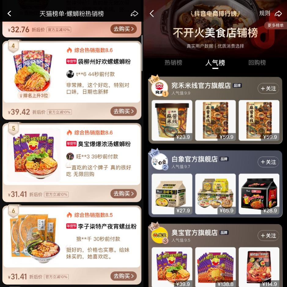 如此大力宣传的效果也是立竿见影,锌刻度从天猫年货节的螺蛳粉热销榜上看到,臭宝螺蛳粉综合热销指数为8.4,排名第五,而此前热度与销量齐飞的李子柒螺蛳粉则以8.3的综合热销指数排在了臭宝螺蛳粉之后,排名第六。