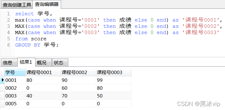 3、下面是学生的成绩表(表名score,列名:学号、课程号、成绩)
