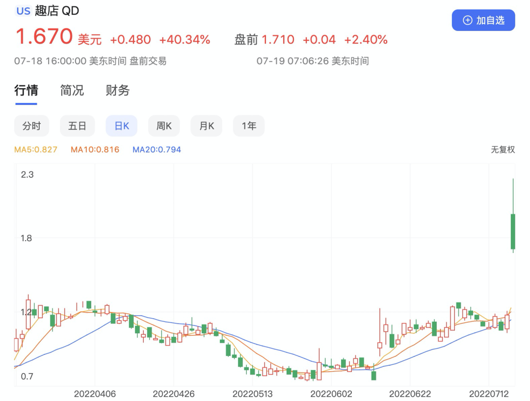 网传,趣店为该场直播投入的营销费用超过1亿元。用真金白银推动带货的同时,“趣店罗老板”账号的粉丝规模,迅速突破500万。上市公司“趣店”(美股股票代码:QD)在直播后的首个交易日(7月18日),股价以超40%涨幅收盘。对比今年3月仅0.6美元的历史最低价,更是涨超2倍。
